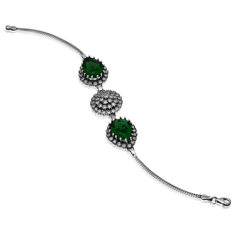 Şıklığı, zarafeti ve bütün ihtişamıyla Hürrem Sultan ve onu yansıtan birbirinden eşsiz takıları... Osmanlı motiflerini taşıyan, doğal taşlı, iri gümüş küpeler tüm kadınların vazgeçilmezi... Hiç bir dönemde zarafetinden ödün vermeyen Hürrem Sultan modellerini doğum günü hediyesi veya annelere hediye olarak özel günlerde tercih edilebilecek mükemmel bir seçenektir. Hürrem Sultan bayan bileklik 925 ayar gümüş kullanılarak imal edilmiştir. Yeşil, beyaz zirkon taşlar kullanılarak ortaya çıkan gümüş Hürrem Sultan bayan bileklik üzerine oksit kaplama yapılmıştır. Tüm gümüş otantik bileklikler modellerinde olduğu gibi gümüş Hürrem Sultan bayan bileklik de el emeği ile üretilmiştir. Gümüş ve değerli taşlar nedeniyle belirtilen ortalama ürün ağırlığında ± %10 sapma olabilmektedir.