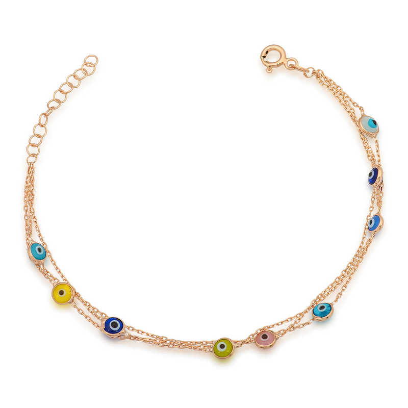 Nazar boncuğunu insanlar uzun yıllardan beri kötü bakıştan korunmak için kullanmışlardır. Kötü bakışların insanlar üzerinde olumsuz etki oluşturmasına karşı bir önlemdir nazar boncuğu… Bu sebeptendir ki insanlar sevdiklerini korumak için nazar boncuğu takmaktadır. Bu nazar bileklik de şıklığı ve zarafeti yansıtıyor. Her dönem sevilen ve şıklığından ödün vermeyen bu modeli; doğum günü hediyesi, sevgililer günü hediyesi olarak özel günlerde tercih edebilirsiniz. Gümüş nazar bayan bileklik, 925 ayar gümüşten imal edilmiştir. Gümüş üzerine rose altın kaplama yapılmıştır. Rose altın kaplama yapılan gümüş bayan bileklikler parlaklığını uzun süre muhafaza eder, oksitlenmesi gecikir ve gümüşe pembe rengi verir. Üzerinde bulunan taşlar camdır. Tüm gümüş bayan bilekliklerinde olduğu gibi bu gümüş nazar bayan bileklik modeli de tamamı el emeği ile üretilmiştir. Gümüş ve değerli taşlar nedeniyle belirtilen ortalama ürün ağırlığında ± %10 sapma olabilmektedir.