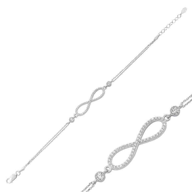 Gümüş zirkon taşlar ve sonsuzluk modelinin bir araya geldiği sevdiklerinize sevginizi gösterebileceğiniz şık ve anlamlı bir hediye olacaktır. 925 ayar gümüşten imal edilmiştir. Gümüş üzerine rodyum kaplama yapılmıştır. Rodyum kaplama yapılan gümüş bayan bileklik modelleri parlaklığını uzun süre muhafaza eder ve oksitlenmesi gecikir. Uzatma zinciri sayesinde her bilek kalınlığına uyum sağlar. Bayan bileklik modellerinin tamamında olduğu gibi gümüş sonsuzluk bayan bileklik modeli de el emeği ile üretilmiştir. Gümüş ve değerli taşlar nedeniyle belirtilen ortalama ürün ağırlığında ± %10 sapma olabilmektedir.