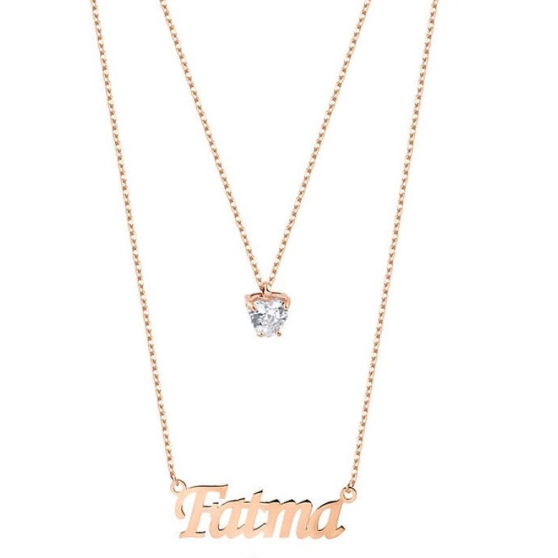 Çift Zincirli İsimli Tek Taşlı Gümüş Rose Kolye GMS1888