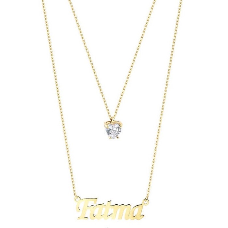 Çift Zincirli İsimli Tek Taşlı Gümüş Sarı Kolye GMS1889