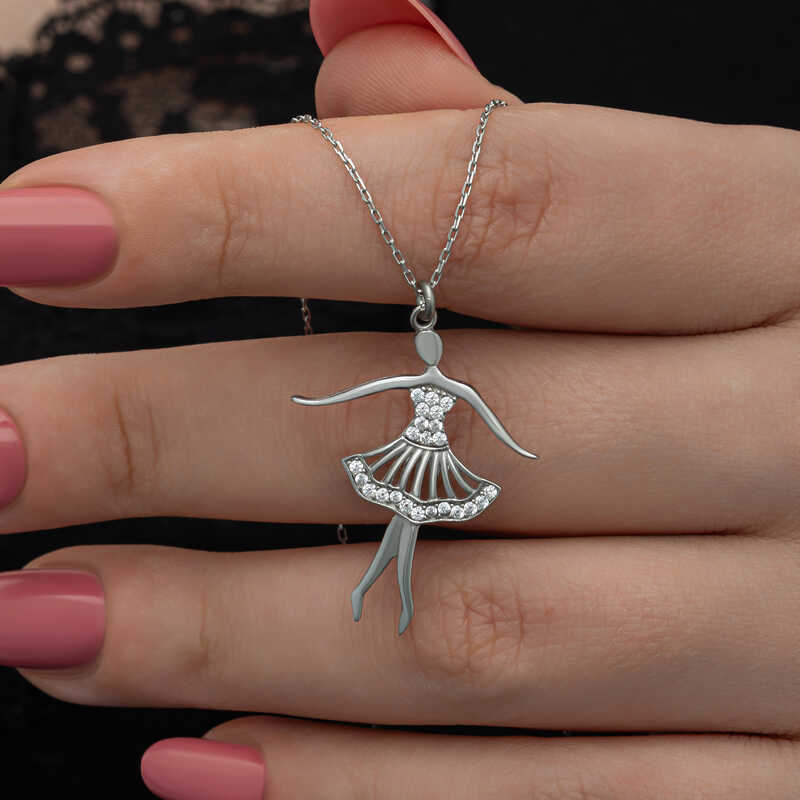 Balerinin en asil anlamlarından biri özgürlüğü simgelemesidir. Ruhun beden üzerindeki etkisini ve bu etkinin yarattığı büyük değişimleri simgeler. Bale; direkt ruhun sembolüdür, ruhun özgürlüğünü, hafifliğini ve zarafetini simgeler. Bu zariflikten yola çıkarak tasarladığımız bu şık kolye; doğum günü hediyesi, sevgililer günü hediyesi veya annelere hediye olarak özel günlerde tercih edilebilecek mükemmel bir seçenektir. Bu mükemmel kolye 925 ayar gümüşten imal edilmiştir. Gümüş üzerine rodyum kaplama yapılmıştır. Rodyum kaplama yapılan kolyeler parlaklığını uzun süre muhafaza eder, oksitlenmesi geciktirir. Üzerinde bulunan taşlar zirkondur. Zincir boyu ortalama 45 cm'dir. Tüm kolyelerde olduğu gibi gümüş balerin Kadın kolye de tamamı el emeği ile üretilmiştir. Gümüş ve değerli taşlar nedeniyle ürün ağırlığında ± %10 sapma olabilmektedir.
