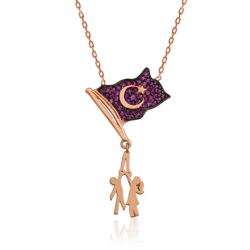 Bayrak; bir milletin varlığının ve bağımsızlığının sembolü, tarihinin hatırasıdır. Bayrağın değeri temsil ettiği milletin kıymeti ile ölçülür. Devletin hakimiyetini, bağımsızlığını ve şerefini temsil ettiği için bayrağa saygı gösterilir. Kırmızı zemin üzerinde hilal ve yıldız bulunan bayrağa efsanevi bir anlam katan inanış vardır. Osmanlıların 1448'de, düşmanlarını ağır bir yenilgiye uğrattığı Kosova savaşından sonraki gece; savaş alanında oluşmuş kan gölünün üzerinde gökyüzünden yansıyan hilal ve yıldız yan yana görünmüştür. Böylece sultan II Murad bu simgeyi devlet bayrakları arasında kullanmaya başlamıştır. Sizde sevdiklerinize gümüş türk bayrağı kolyeyi armağan edebilir onları sevindirebilirsiniz. Bayrak tutan çocuklar kolye modeli 925 ayar gümüşten imal edilmiştir. Gümüş üzerine rodyum kaplama yapılmıştır. Rodyum kaplama yapılan gümüş kolye modelleri parlaklığını uzun süre muhafaza eder ve oksitlenmesi gecikir. Gümüş kolyenin ortalama boyu 45 cm'dir. Tüm kolye modellerinde olduğu gibi gümüş Türk Bayrağı modeli de el emeği ile üretilmiştir. Gümüş ve değerli taşlar nedeniyle belirtilen ortalama ürün ağırlığında ± %10 sapma olabilmektedir.