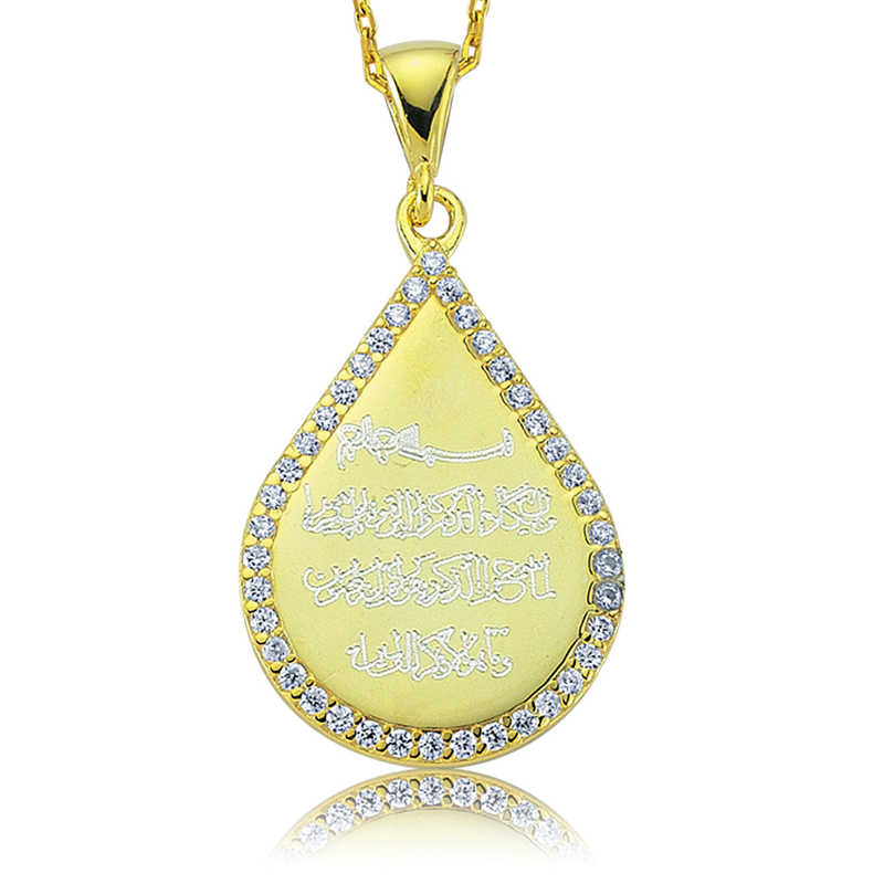 Nazar bakış demektir ve her canlıya nazar değebilmektedir. Bu nazar hastalığından korunmak, şifa bulmak için nazar duası okunur... Bu maneviyatı yüksek kolye; doğum günü hediyesi, sevgililer günü hediyesi veya annelere hediye olarak özel günlerde tercih edilebilecek mükemmel bir seçenektir. Kolye; 925 ayar gümüşten imal edilmiştir. Kolye üzerine altın kaplama yapılmıştır. Altın kaplama yapılan ürünler parlaklığını uzun süre muhafaza eder, gümüşü sarı renge dönüştürür ve oksitlenmeyi geciktirir. Kolye üzerinde bulunan taşlar zirkondur. Tüm gümüş bayan kolyelerde olduğu gibi gümüş taşlı nazar duası bayan kolye modeli de el emeği ile üretilmiştir. Gümüş ve değerli taşlar nedeniyle belirtilen ortalama ürün ağırlığında ± %10 sapma olabilmektedir.