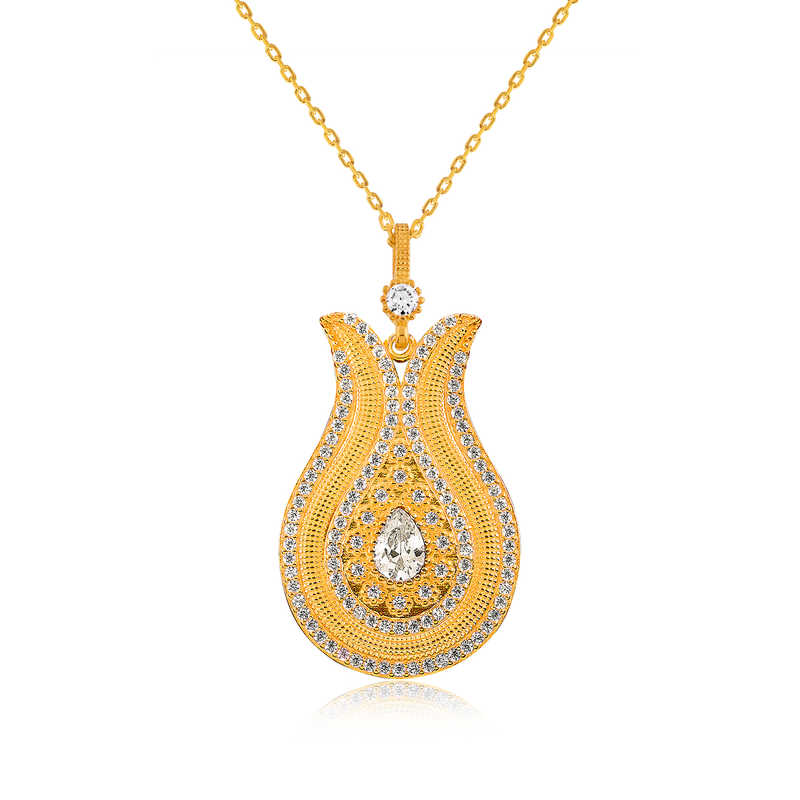 Rengi ve şekli açısından sevgilinin yüzüne, yanağına, dudağına benzetilen 'Lale', yine rengi dolayısıyla aşığın yanağına ve içindeki tomurcuklarıyla da aşığın gönlündeki yaralara benzetilmektedir. Tasavvuf düşüncesinde ise; Lale'nin renkli yapraklarının yukarıya doğru olması halinin, bir dervişin dua edişindeki edayı andırdığı kabul ediliyor. Siz de sevdiklerinizin boynunu bu özel gümüş lale kolye ile süslemeye ne dersiniz... 925 ayar gümüşten imal edilmiştir. Gümüş üzerine altın kaplama yapılmıştır. Altın kaplama yapılan ürünler parlaklığını uzun süre muhafaza eder ve gümüşe altın rengi verir. Üzerinde bulunan taşlar zirkondur. Zincir boyu ortalama 50 - 55 cm'dir. Ürünlerimizin tamamı el emeği ile üretilmiştir. Gümüş ve değerli taşlar nedeniyle belirtilen ortalama ürün ağırlığında ± %10 sapma olabilmektedir.