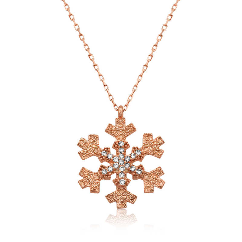 Doğanın mucizevi kristalleri her ne kadar şekilleri, özellikleri ve görünüşleri birbirine çok yakın olsa da, aslında her bir kar tanesinin eşsiz olduğu biliniyor. Hiçbir kar tanesi bir diğerine benzemiyor, her kar tanesinden aslında sadece bir tane var… Sevdiğiniz kişiye hediye ettiğiniz kar tanesi kolye ile onun sizin için eşsiz ve biricik olduğunu sessizce dillendirmiş oluyorsunuz. Bu şık kolye modeli 925 ayar gümüşten imal edilmiştir. Gümüş üzerine rose altın kaplama yapılmıştır. Rose altın kaplama yapılan gümüş kolye modelleri parlaklığını uzun süre muhafaza eder. Sizlerde her zevke uygun kar tanesi kolye ile şıklığınıza ışıltı katın. Ürünlerimizin tamamı el emeği ile üretilmiştir. Gümüş ve değerli taşlar nedeniyle belirtilen ortalama ürün ağırlığında ± %10 sapma olabilmektedir.