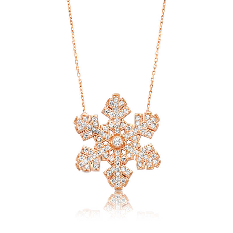Kar yağdığında yere düşen her kar tanesi birbirinden farklıdır. Yani her bir kar tanesi eşsizdir. Sizde sevdiğinizin yeryüzünde tek olduğunu düşünüyorsanız bu kar tanesi bayan kolye çok anlamlı bir hediye olacaktır. Kar tanesi bayan kolye modeli 925 ayar gümüşten imal edilmiştir. Gümüş üzerine rose altın kaplama yapılmıştır. Rose altın kaplama yapılan gümüş bayan kolye modelleri parlaklığını uzun süre muhafaza eder ve oksitlenmesi gecikir. Kolye üzerinde bulunan beyaz taşlar zirkondur. Gümüş olan zincir boyu ortalama 45 cm'dir. Gümüş kar tanesi bayan kolye modeli diğer gümüş bayan kolye modellerinde olduğu gibi el emeği ile üretilmiştir. Gümüş ve değerli taşlar nedeniyle belirtilen ürün ağırlığında ± %10 sapma olabilmektedir.