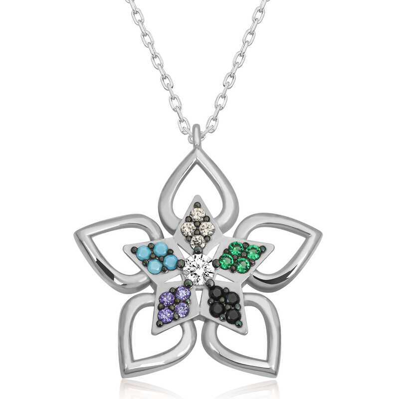 Sevdiklerinize duygularınızı ifade etmenin en özel ve zarif yolu O’na gönderebileceğiniz şık, rengarenk ve mis kokulu çiçeklerdir. Özel günlerde verilecek hediyeler arasında olan çiçek, bu kez farklı bir yorumla tasarlandı...  Renkli taşlı çiçek kolye sevgisini bir kez daha anlatmak isteyenleri, sen bir çiçeksin demek isteyenleri bekliyor. Bu özel tasarım, çiçek kadın kolye 925 ayar gümüşten imal edilmiştir. Gümüş üzerine rodyum kaplama yapılmıştır. Rodyum kaplama yapılan gümüş kadın kolye modelleri parlaklığını uzun süre muhafaza eder ve oksitlenmesi gecikir. Kolye üzerinde bulunan taşlar zirkondur. Tüm kadın gümüş kolye modellerinde olduğu gibi gümüş çiçek kadın kolye de el emeği ile üretilmiştir. Gümüş ve değerli taşlar nedeniyle belirtilen ürün ağırlığında ± %10 sapma olabilmektedir.