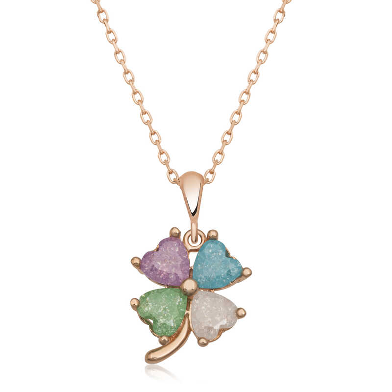 Gümüş Rose Renkli Taşlı Kalp Yonca Kadın Kolye