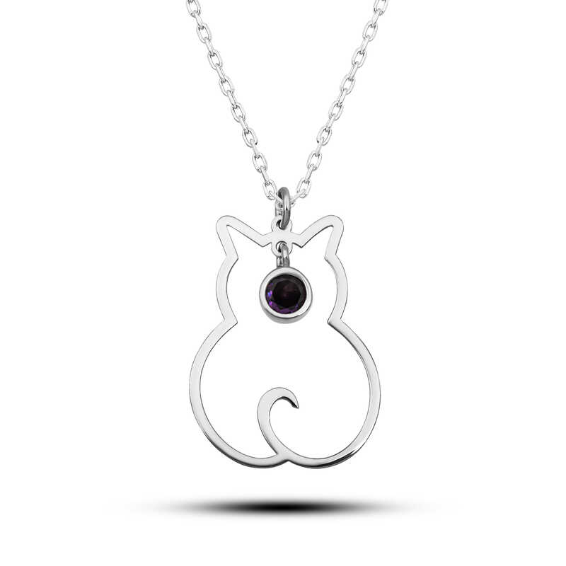 Gümüş Şubat Ayı Doğum Taşı Kedi Kadın Kolye