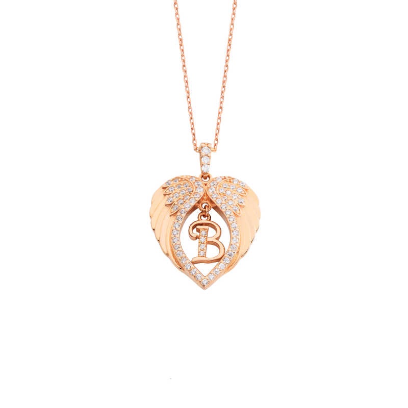 Kalp Motifli Melek Kanadı Harfli Gümüş Kolye GMS893