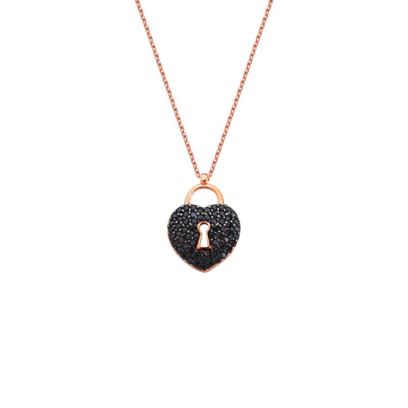 Kilitli Kalp Siyah Taşlı Gümüş Kolye GMS62