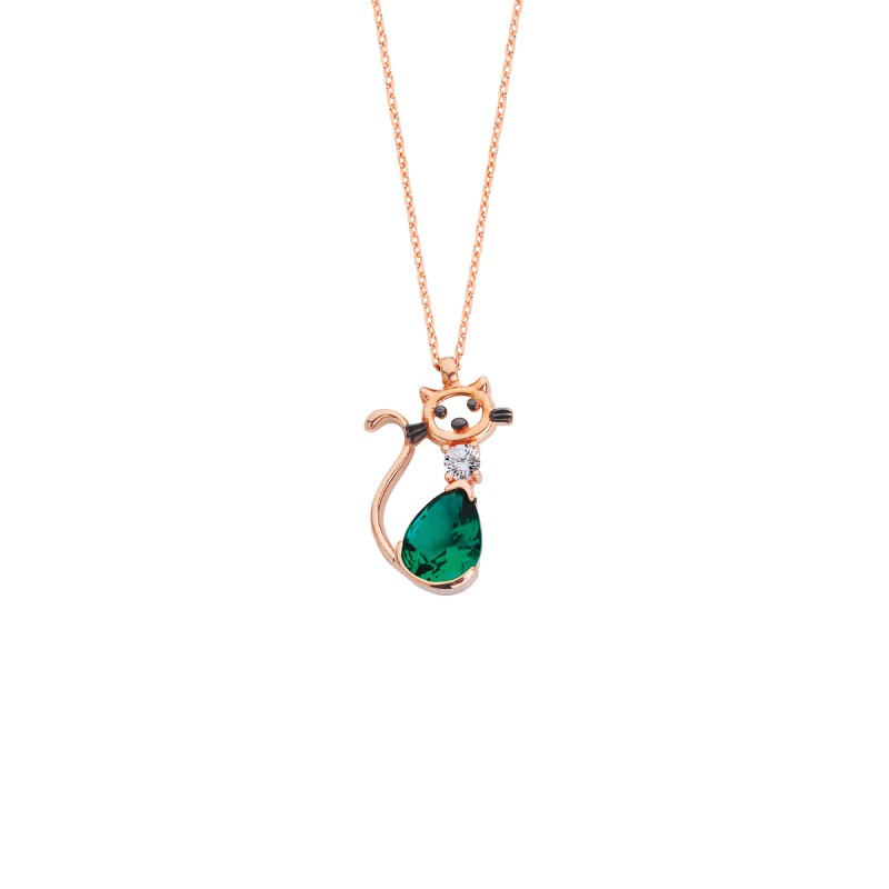 Yeşil Taşlı Kedi Gümüş Kolye GMS58