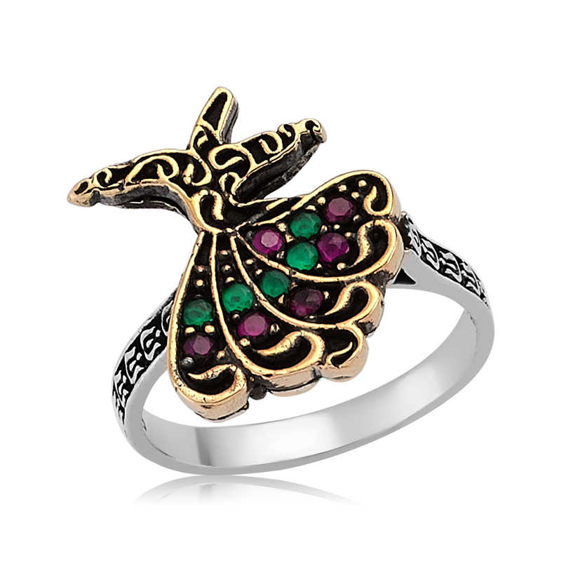 Sema’ eden canlara Sema'zen denilmiştir. Sema’, sembolik olarak, kâinatın oluşumunu, insanın âlemde dirilişini, Yüce Yaratıcı’ya olan aşk ile harekete geçişini ve kulluğunu idrak edip “İnsan- ı Kâmil” e doğru yönelişini ifâde eder.Semazen'in başına giydiği sikkesi onun mezar taşını, üstündeki tennuresi kefenini omuzuna aldığı hırkasıda mezarını temsil eder. Yani o ölmeden ölmüş, hak ile hak olmuştur... Semazenin sağ elleri yukarı sol elleri aşağı dönüktür sema esnasında... Yani "haktan alırım halka veririm". der. Maneviyatı yüksek bu modeli; doğum günü hediyesi, sevgililer günü hediyesi veya annelere hediye olarak özel günlerde tercih edebilirsiniz. Gümüş Semazen Bayan Yüzük 925 ayar gümüşten imal edilmiştir. Gümüş üzerine oksit ve rodyum kaplama yapılmıştır. Rodyum kaplama yapılan gümüş bayan yüzük modelleri parlaklığını uzun süre muhafaza eder, oksitlenmesi gecikir. Tüm gümüş bayan yüzük modellerinde olduğu gibi bu gümüş Semazen Bayan Yüzük modeli de tamamı el emeği ile üretilmiştir. Gümüş ve değerli taşlar nedeniyle belirtilen ortalama ürün ağırlığında ± %10 sapma olabilmektedir.