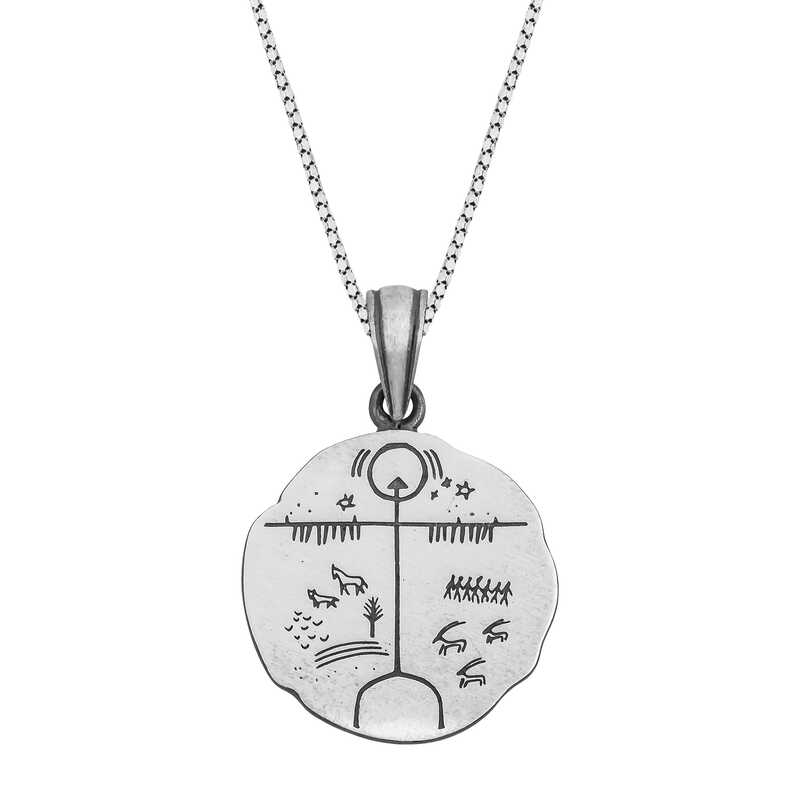 Eski Türklerin Gök Tanrı inancında şamanların kullandığı kam davullarının üzerinde bulunan kozmik alemi yansıtan semboldür. Bu şık tasarım kolye 925 ayar gümüşten imal edilmiştir. Gümüş üzerine oksit kaplama yapılmıştır. Tüm gümüş ürünlerde olduğu gibi gümüş erkek Gök Tenri kolye de tamamı el emeği ile üretilmiştir. Gümüş ve değerli taşlar nedeniyle belirtilen ortalama ürün ağırlığında ± %10 sapma olabilmektedir.