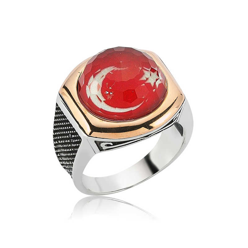 Türk bayrağının ilhamını da kan gölüne yansıyan ay ve yıldızdan aldığını biliyoruz. Bayrağın taşıdığı kutsal anlamı boynunuzda taşımak ve sevdiklerinizle paylaşmak için kaçırılmayacak bir fırsat sunuyoruz. Bu şık tasarım yüzüğü; kendinize yada sevdiklerinize doğum gününde, babalar gününde yada özel günlerde hediye edebilirsiniz. Ay yıldız erkek yüzük 925 ayar gümüşten imal edilmiştir. Gümüş üzerine oksit kaplama yapılmıştır. Tüm gümüş erkek yüzüklerinde olduğu gibi gümüş ay yıldız erkek yüzük de tamamı el emeği ile üretilmiştir. Gümüş ve değerli taşlar nedeniyle belirtilen ortalama ürün ağırlığında ± %10 sapma olabilmektedir.