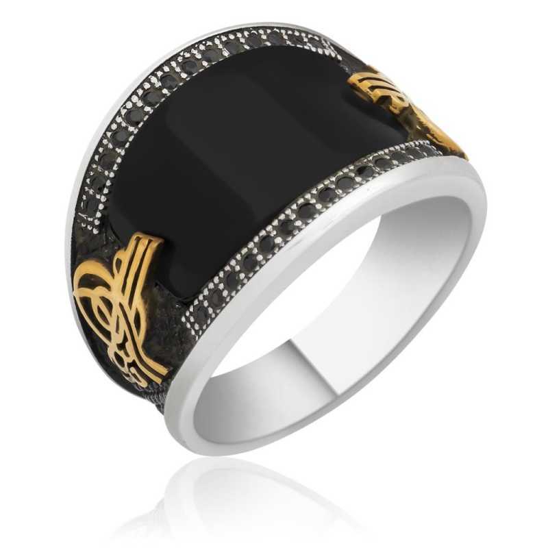 Gümüş Siyah Taşlı Tuğralı Erkek Yüzük