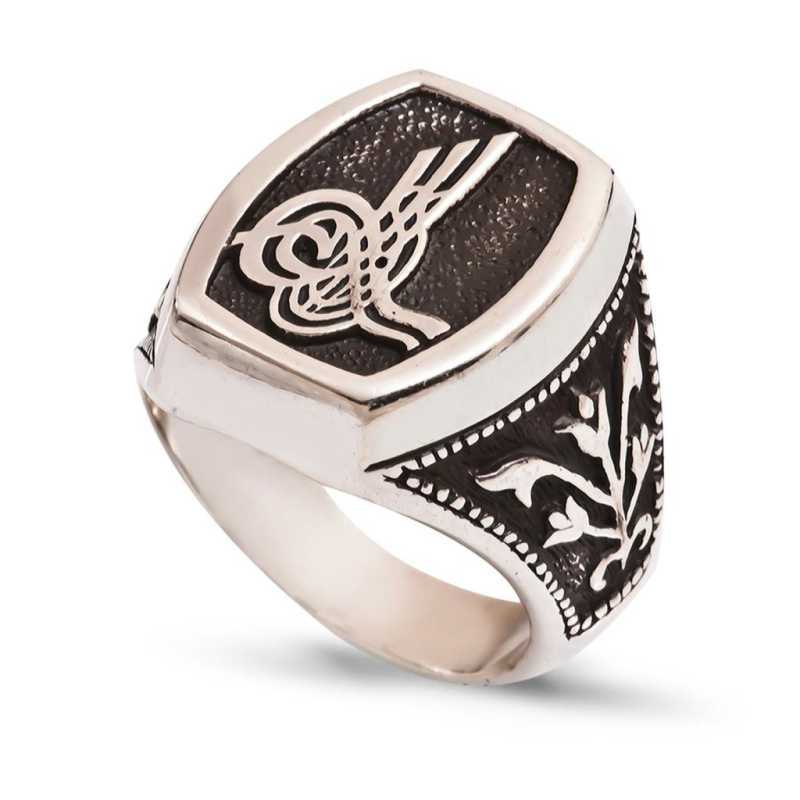 Tuğra, Osmanlı sultanlarının imzası anlamına gelir. Her tuğra; ona ait olan padişahın ismini, varlığını, hükümdarlığını ifade eder. Tuğra sembolü her padişaha göre farklı olmak üzere birçok şekilde günümüze ulaşmıştır. Tuğra Osmanlının her döneminde korunmuş, önemini hiç kaybetmemiştir. Ve zamanla hat sanatımızda da önemli bir yere sahip olup, günümüzde hattatlar tarafından sanatsal olarak yaşatılmaktadır. Bu sanatı yansıtan gümüş yüzüğü severek kullanabilir, babalar gününde yada özel günlerde sevdiklerinize hediye edebilirsiniz. Gümüş tuğralı erkek yüzük 925 ayar gümüşten imal edilmiştir. Tuğralı yüzük gümüş üzerine oksit kaplama yapılmıştır.Tüm gümüş erkek yüzüklerde olduğu gibi gümüş tuğralı erkek yüzüğünde tamamı el emeği ile üretilmiştir. Gümüş ve değerli taşlar nedeniyle belirtilen ortalama ürün ağırlığında ± %10 sapma olabilmektedir.