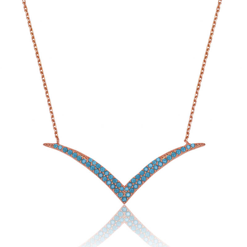 Modern tarzda üretilen martı desenli firuze taşlı gümüş kolye özel tasarım koleksiyondur. Günümüzün trendlerine uygun modeliyle herkesin severek takıp sürekli kullanacağı veya sevdiklerine hediye edebileceği şık bir gümüş kolyedir. 925 ayar gümüşten imal edilmiştir. Gümüş üzerine rose kaplama yapılmıştır. Rose kaplama yapılan gümüş bayan kolye modelleri parlaklığını uzun süre muhafaza eder, gümüş rengini pembe renge dönüştürür ve oksitlenmeyi geciktirir. Üzerinde bulunan taşlar firuze renkli zirkondur. Zincir boyu ortalama 45 cm'dir. Gümüş bayan kolye modellerinin tamamında olduğu gibi gümüş firuze taşlı martı bayan kolye de el emeği ile üretilmiştir. Gümüş ve değerli taşlar nedeniyle belirtilen ortalama ürün ağırlığında ± %10 sapma olabilmektedir.
