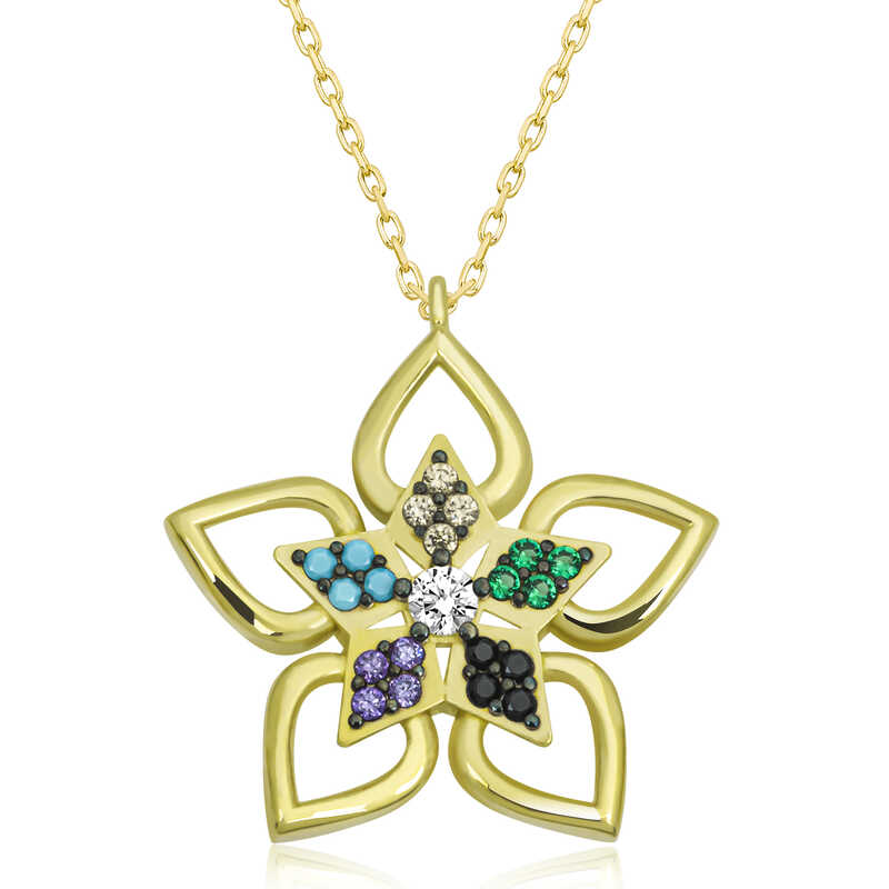 Sevdiklerinize duygularınızı ifade etmenin en özel ve zarif yolu O’na gönderebileceğiniz şık, rengarenk ve mis kokulu çiçeklerdir. Özel günlerde verilecek hediyeler arasında olan çiçek, bu kez farklı bir yorumla tasarlandı...  Renkli taşlı çiçek kolye sevgisini bir kez daha anlatmak isteyenleri, sen bir çiçeksin demek isteyenleri bekliyor. Bu özel tasarım, çiçek kadın kolye 925 ayar gümüşten imal edilmiştir. Gümüş üzerine gold kaplama yapılmıştır. Gold kaplama yapılan gümüş kadın kolye modelleri parlaklığını uzun süre muhafaza eder ve oksitlenmesi gecikir. Kolye üzerinde bulunan taşlar zirkondur. Tüm kadın gümüş kolye modellerinde olduğu gibi gümüş çiçek kadın kolye de el emeği ile üretilmiştir. Gümüş ve değerli taşlar nedeniyle belirtilen ürün ağırlığında ± %10 sapma olabilmektedir.