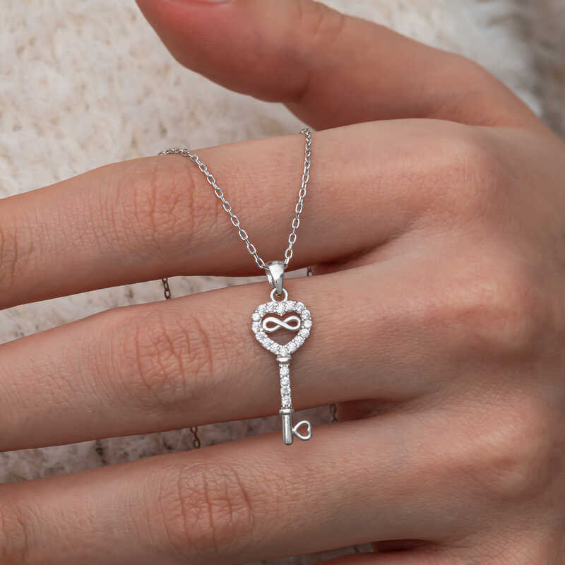 Gümüş Kalpli Sonsuzluk Anahtar Kadın Kolye