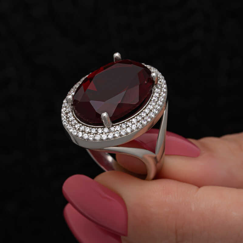 Gümüş Kırmızı Oval Taşlı Kadın Yüzük