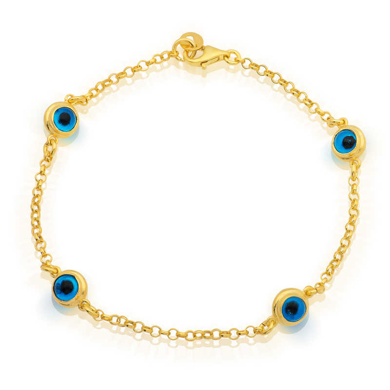 Bir çok kültürde kötü enerjinin zararlarından korunmak için çeşitli tılsımlar kullanılmıştır. Doğu kültürlerinin çoğunda kullanılan tılsım ise gözdür. Nazar boncuğu da göz şeklinden ilhamla tasarlanmıştır. Mavi rengin seçilmesi de tesadüf değildir. Renkli gözlü kişilerin enerjisini daha etkili yansıttığı inancı gereği nazar boncukları çoğunlukla mavi olarak tasarlanır. Güzelliğiyle göz kamaştıran, nazardan korunmasını istediğiniz kişilere ve sevdiklerinize gümüş nazar bilekliği armağan edebilirsiniz. Gümüş Nazar Boncuklu Bayan Bileklik modeli 925 ayar gümüşten imal edilmiştir. Gümüş üzerine altın kaplama yapılmıştır. Altın kaplama yapılan gümüş bayan bileklik modelleri parlaklığını uzun süre muhafaza eder. Bileklik üzerinde bulunan gözler cam ile yapılmıştır. Gümüş bileklik modellerinin tamamında olduğu gibi gümüş nazar boncuklu bayan bileklik modeli el emeği ile üretilmiştir. Gümüş ve değerli taşlar nedeniyle belirtilen ortalama ürün ağırlığında ± %10 sapma olabilmektedir.​
