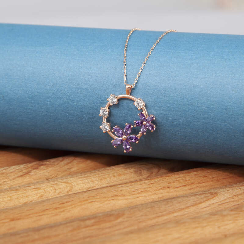 Gümüş Rose Mor Çiçek Kadın Kolye