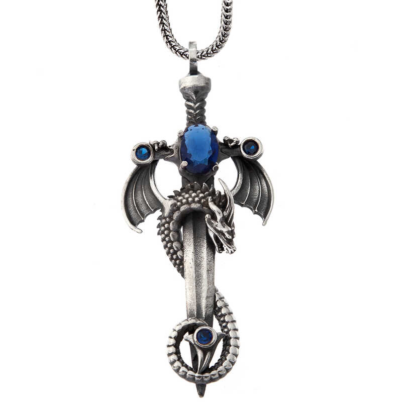 Gümüş Safir Taşlı Ejderha Erkek Kılıç Kolye