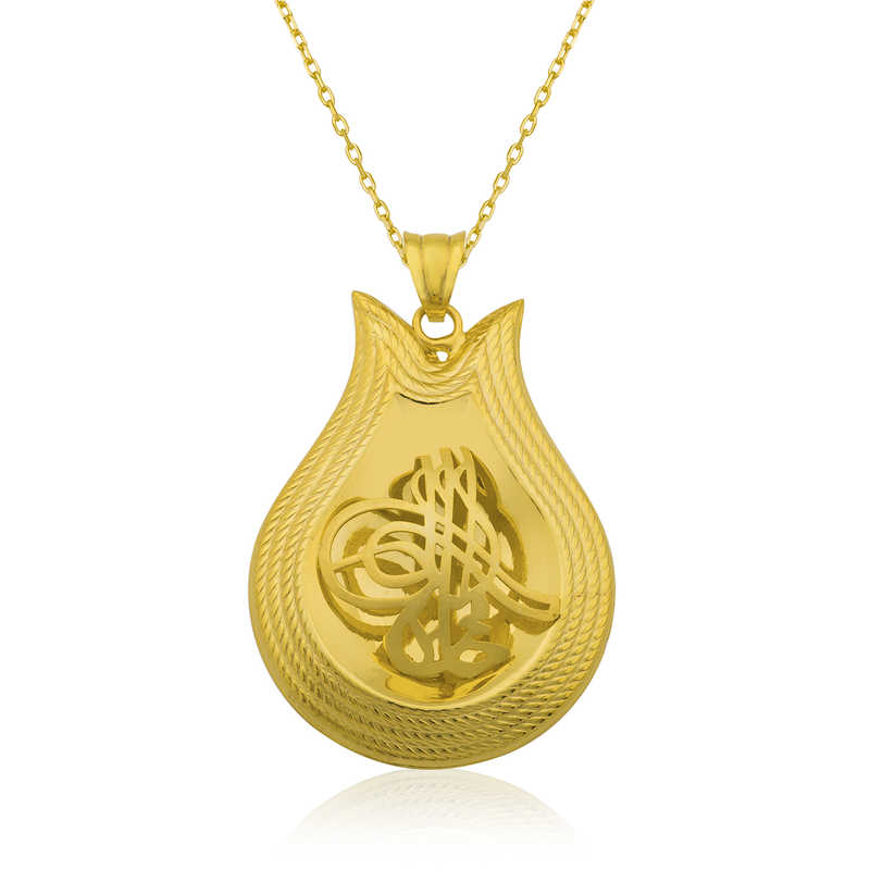 Tuğra, Osmanlı sultanlarının imzası anlamına gelir. Her tuğra; ona ait olan padişahın ismini, varlığını, hükümdarlığını ifade eder. Tuğra sembolü her padişaha göre farklı olmak üzere birçok şekilde günümüze ulaşmıştır. Tuğra Osmanlının her döneminde korunmuş, önemini hiç kaybetmemiştir. Ve zamanla hat sanatımızda da önemli bir yere sahip olup, günümüzde hattatlar tarafından sanatsal olarak yaşatılmaktadır. Bu mükemmel kolyeyi; doğum günü hediyesi, sevgililer günü hediyesi veya annelere hediye olarak özel günlerde tercih edebilirsiniz. Sarı tuğra bayan kolye 925 ayar gümüşten imal edilmiştir. Gümüş üzerine altın kaplama yapılmıştır. Altın kaplama yapılan kolyeler parlaklığını uzun süre muhafaza eder, gümüş rengini sarı renge dönüştürür ve oksitlenmeyi geciktirir. Üzerinde bulunan beyaz taşlar zirkondur. Tüm gümüş bayan kolyelerde olduğu gibi gümüş sarı tuğra bayan kolye de el emeği ile üretilmiştir. Gümüş ve değerli taşlar nedeniyle belirtilen ürün ağırlığında ± %10 sapma olabilmektedir.