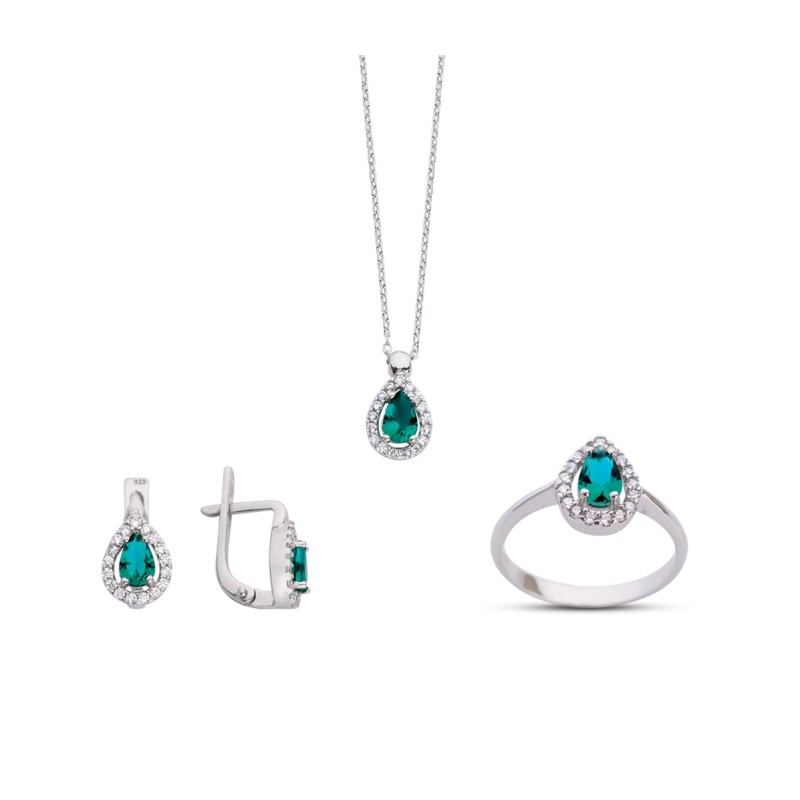 Damla Zümrüt Rengi Anturaj Beyaz Gümüş Set GMS136