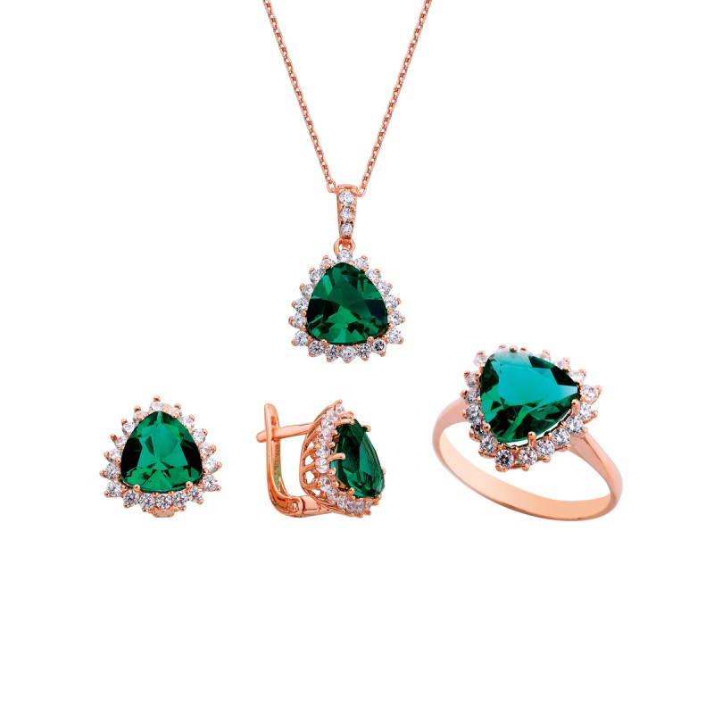 Üçgen Zümrüt Rengi Taşlı Anturaj Gümüş Set GMS163