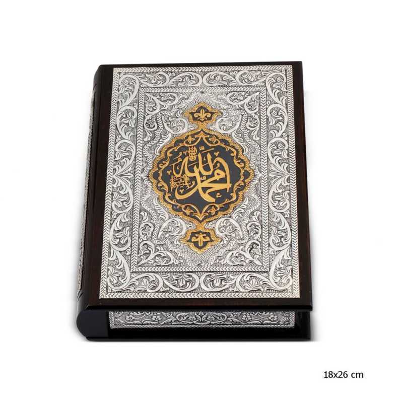 Kur'an-ı Kerim ve Kuran Kabı ceviz rengi ahşap üzerine 925 ayar gümüş kaplamadır.