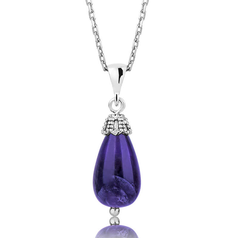 Asırlar boyunca birçok medeniyet tarafından kullanılmış ve günümüze kadar değerini korumuş olan Ametist, hemen her dönem en gözde değerli taşlardan biri olmuştur. Çeşitli kültürlerde “mor yakut”, “mor necef” adlarıyla, kimi zaman da “aşk taşı” olarak tanımlanmıştır. Ametist taşı; tüm değerli taşlar gibi takı, süs ve ziynet eşyalarının yapımında ve oymacılıkta kullanılmaktadır. Takı ve mücevheratta, özellikle şifa ve pozitif enerji verdiğine inanılan koyu mor Ametist öne çıkar. Sadece beden ile temasında değil, taşın bulunduğu ortama yaydığı pozitif enerji de büyük rağbet görmesinde etkilidir. Bu özel taştan imal edilen kolye modelinin metal olan kısımları 925 ayar gümüşten imal edilmiştir. Gümüş üzerine oksit kaplama yapılmıştır. Oksit kaplama yapılan gümüş doğal taşlı bayan kolye modelleri parlaklığını uzun süre muhafaza eder ve oksitlenmesi gecikir. Gümüş olan zincir boyu ortalama 45 cm'dir. Ürünlerimizin tamamında olduğu gibi gümüş ametist taşlı bayan kolye modeli de el emeği ile üretilmiştir. Gümüş ve değerli taşlar nedeniyle ürün ağırlığında ± %10 sapma olabilmektedir.