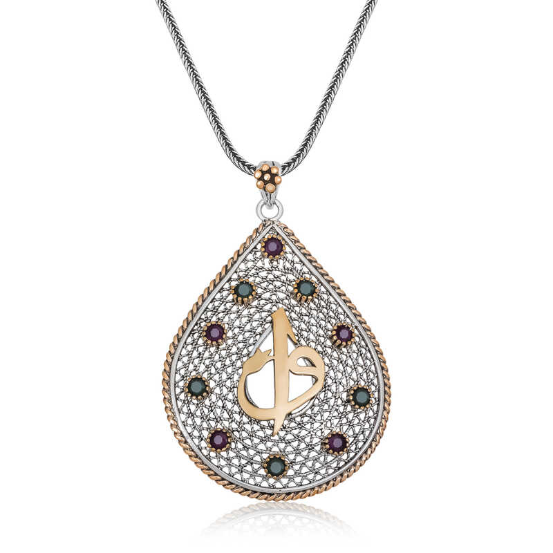 Bu şık tasarım elif vav model otantik kolye modeli 925 ayar gümüş ve bronz madenleri kullanılarak üretilmiştir. Kırmızı, yeşil zirkon taşlar kullanılarak imal edilen bu desenli otantik elif vav bayan kolye modeli üzerine oksit kaplama yapılmıştır. Oksitli gümüş otantik bayan kolye modelleri ilk günkü halini uzun süre muhafaza eder. Gümüş otantik bayan kolye modeli ile birlikte gelecek zincir 925 ayar gümüşten imal edilmiştir ve uzunluğu 55 cm’dir. Tüm gümüş otantik kolye modellerinde olduğu gibi gümüş otantik elif vav kolye modeli de el emeği ile üretilmiştir. Gümüş ve değerli taşlar nedeniyle belirtilen ortalama ürün ağırlığında ± %10 sapma olabilmektedir. Zarif bir görünüm yakalamak isteyen tüm bayanlara hitap eden, modası hiç geçmeyecek bu otantik kolye sizleri bekliyor.