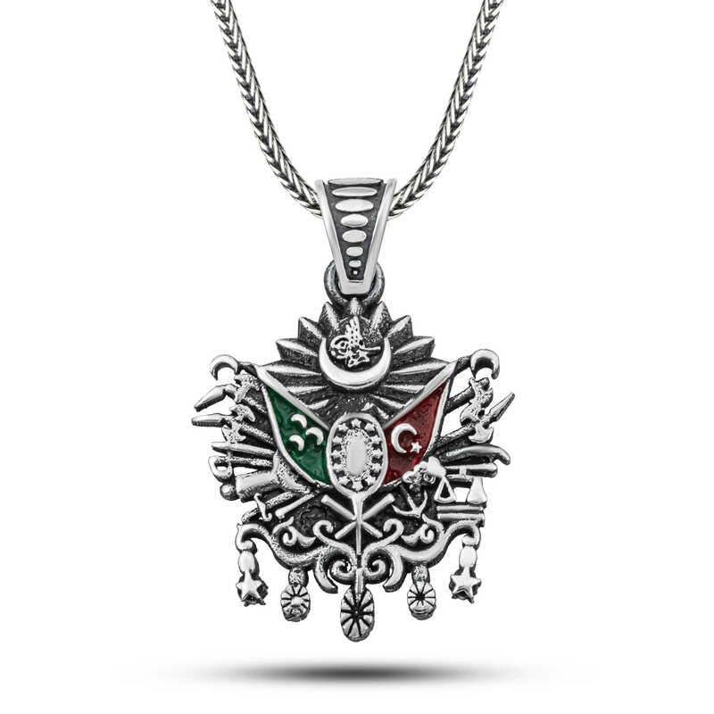 Tarihin ihtişamını stilinize taşıyın!Osmanlı İmparatorluğu'nun görkemli mirasını modern tasarım ile buluşturan bu özel kolye,güçlü duruşunuzu ve zarif zevkinizi yansıtmak için tasarlandıOsmanlı Devlet Arması,ihtişamı ve gücü temsil eder.Bu kolye,tarih tutkunları ve özgün tarzını ortaya koymak isteyen erkekler için ideal bir aksesuardır.Gümüş üzerine oksit kaplama yapılmıştır.Oksit kaplama yapılan gümüş kolyeler parlaklığını uzun süre muhafaza eder,oksitlenmesi gecikir.Ürünlerimizin tamamı el emeği ile üretilmiştir. Gümüş ve değerli taşlar nedeniyle belirtilen ortalama ürün ağırlığında ± %10 sapma olabilmektedir.