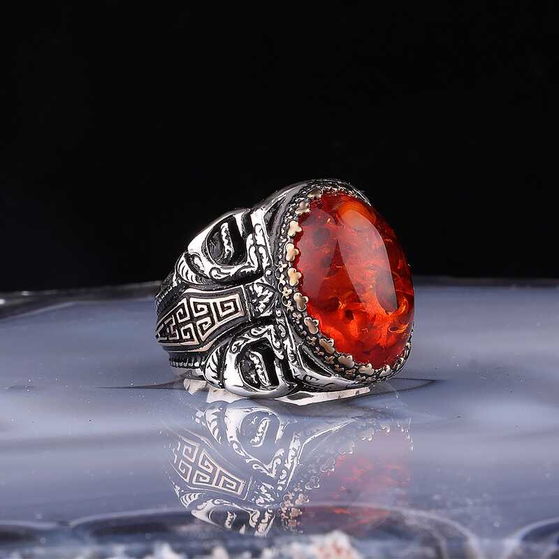 Gümüş Kehribar Taşlı Oval Erkek Yüzük