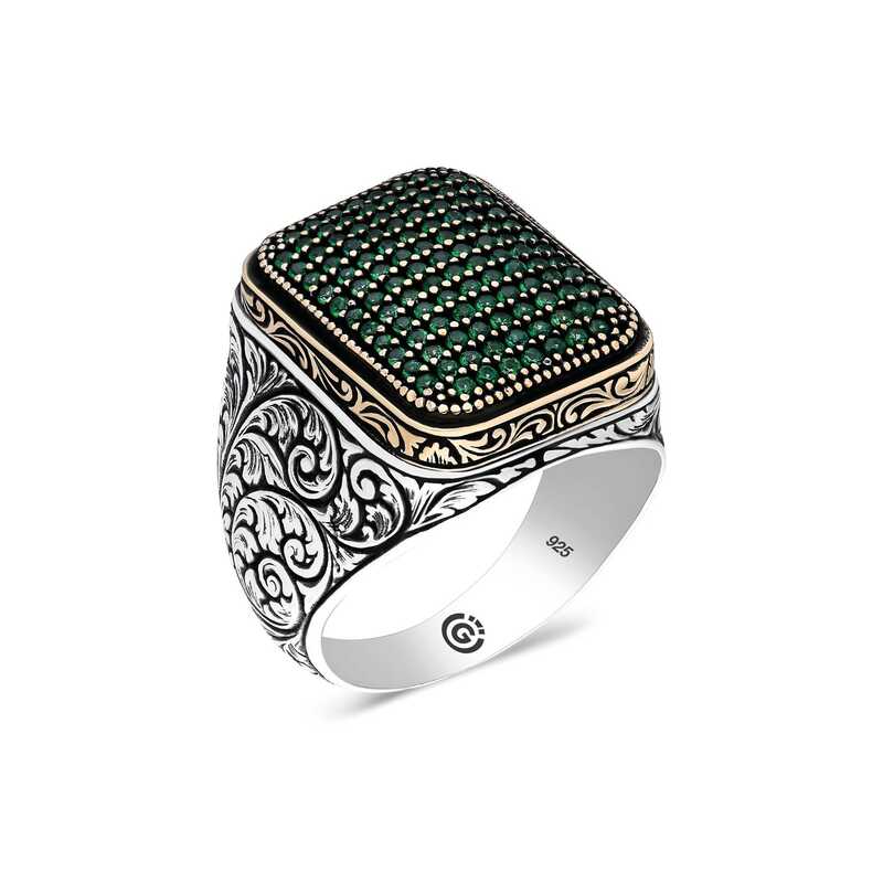 Gümüş Yeşil Zirkon Taşlı Kare Erkek Yüzük
