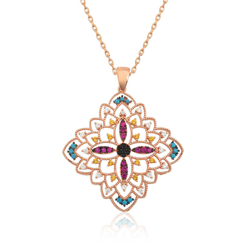 Renkli zirkon taşlar ile süslenmiş etnik desenli madalyon kolye, şık ve ışıltıyı sevenler için tasarlandı. Günün her anında severek kullanabileceğiniz, herkesin beğenisini toplayabilecek ve göz kamaştırabilecek bir üründür. Gümüş etnik desenli madalyon bayan kolye 925 ayar gümüşten imal edilmiştir. Bu kolye üzerine rose kaplama yapılmıştır.Rose kaplama yapılan ürünler parlaklığını uzun süre muhafaza eder ve gümüşü bakır rengine dönüştürür. Üzerinde bulunan taşlar zirkon'dur. Tüm gümüş bayan kolye modellerinde olduğu gibi gümüş etnik desenli madalyon bayan kolye modeli de el emeği ile üretilmiştir. Gümüş ve değerli taşlar nedeniyle belirtilen ortalama ürün ağırlığında ± %10 sapma olabilmektedir.Ürünlerimizin tamamı el emeği ile üretilmiştir.