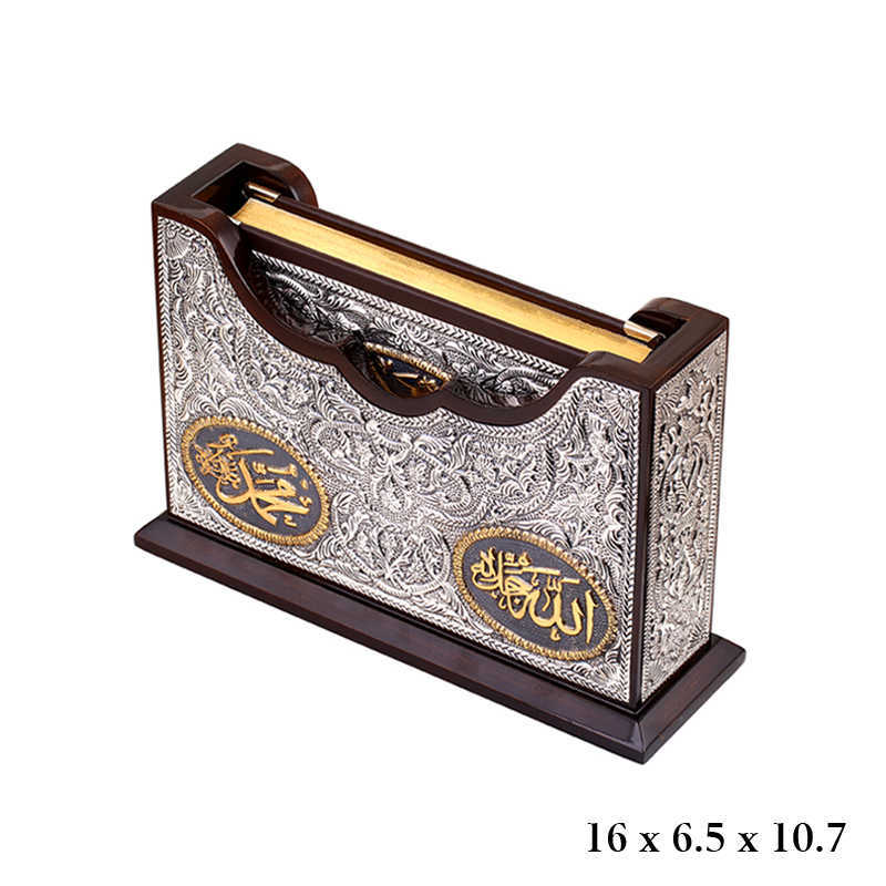 Bu ürün Kur'an-ı Kerim ve kabı olmak üzere iki parçadan oluşmaktadır. Hem evinize, hem sevdiklerinize manevi değeri yüksek çok özel bir hediye seçeneğidir. Kur'an-ı Kerim ve kabı ceviz rengi ahşap üzerine 925 ayar gümüş işlemelerle süslenmiştir. Altın rengi olan kısımlar gümüş üzeri altın kaplamadır. Bu şık ve çok özel ürün tamamen el emeği ile üretilmiştir.