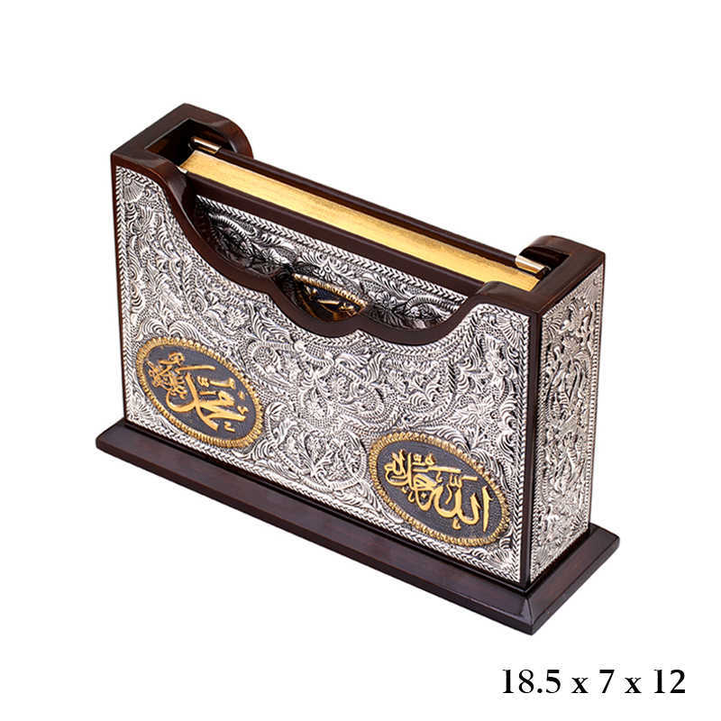Bu ürün Kur'an-ı Kerim ve kabı olmak üzere iki parçadan oluşmaktadır. Hem evinize, hem sevdiklerinize manevi değeri yüksek çok özel bir hediye seçeneğidir. Kur'an-ı Kerim ve kabı ceviz rengi ahşap üzerine 925 ayar gümüş işlemelerle süslenmiştir. Altın rengi olan kısımlar gümüş üzeri altın kaplamadır. Bu şık ve çok özel ürün tamamen el emeği ile üretilmiştir.