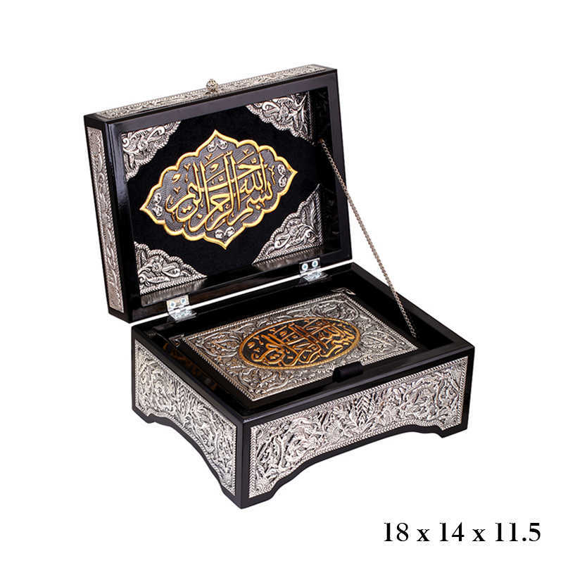 Bu ürün Kur'an-ı Kerim ve kapaklı sandık olmak üzere iki parçadan oluşmaktadır. Hem evinize, hem sevdiklerinize manevi değeri yüksek çok özel bir hediye seçeneğidir. Kur'an-ı Kerim ve Kuran Sandığı ceviz rengi ahşap üzerine 925 ayar gümüş işlemelerle süslenmiştir. Altın rengi olan kısımlar gümüş üzeri altın kaplamadır. Bu şık ve çok özel ürün tamamen el emeği ile üretilmiştir.