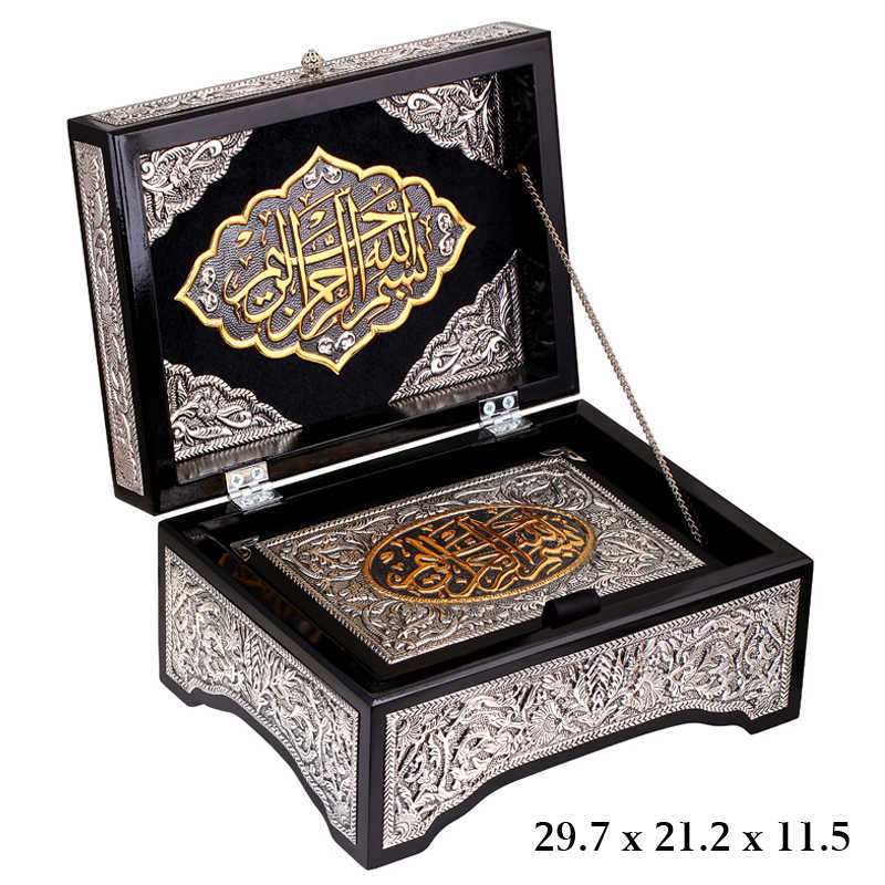 Bu ürün Kur'an-ı Kerim ve kapaklı sandık olmak üzere iki parçadan oluşmaktadır. Hem evinize, hem sevdiklerinize manevi değeri yüksek çok özel bir hediye seçeneğidir. Kur'an-ı Kerim ve Kuran Sandığı ceviz rengi ahşap üzerine 925 ayar gümüş işlemelerle süslenmiştir. Altın rengi olan kısımlar gümüş üzeri altın kaplamadır. Bu şık ve çok özel ürün tamamen el emeği ile üretilmiştir.