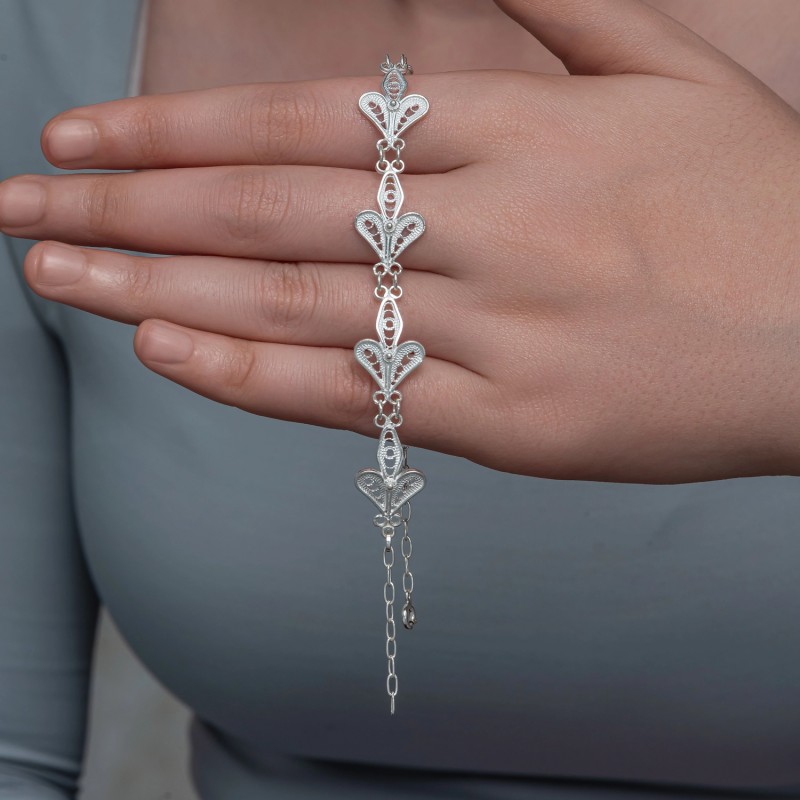 Geleneksel telkari sanatının ince işçiliğini modern bir zarafetle buluşturan Gümüş Üç Yaprak Telkari Kadın Bileklik, üç yaprak formundan oluşan zarif motifleriyle bilekte göz alıcı bir duruş sergiler. Her bir yaprak deseni, ustaların el emeğiyle işlenmiş kıvrımlı tel detaylarıyla zenginleştirilerek tasarıma benzersiz bir derinlik kazandırır.925 ayar gümüşten üretilen bileklik, hafif yapısı ve pürüzsüz dokusuyla gün boyu rahat kullanım sağlar. Ayarlanabilir zincir yapısı sayesinde farklı bilek ölçülerine uyum sunar ve hem günlük şıklığa hem de özel gün kombinlerine zarif bir tamamlayıcı olarak eşlik eder.Zamansız tasarımı, çiçeksi formu ve ince işleme detaylarıyla dikkat çeken bu özel bileklik, sevdiklerine anlamlı, estetik ve değerli bir hediye arayanlar için mükemmel bir seçimdir.Gümüş ve değerli taşlar nedeniyle belirtilen ortalama ürün ağırlığında ± %10 sapma olabilmektedir.