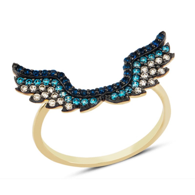 14 Ayar Altın Mavi Taşlı Melek Kanadı Yüzük YZK068B